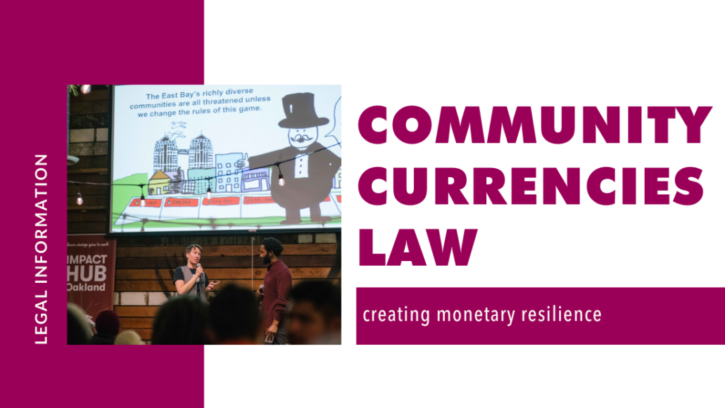CommunityCurrenciesLaw is a user-supported library of tools and resources to support economies based on barter, gifts, time banks, and local currencies. Search our Topics for legal resources and research on regulatory issues including tax law, employment law, securities law, and more.